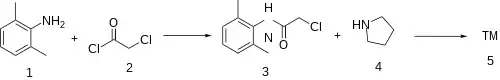Amide formation between 2,6-Dimethylaniline (1) and Chloroacetyl chloride (2) gives [1131-01-7] (3). Displacement of the remaining halogen by pyrrolidine (4) completed the synthesis of Pyrrocaine (5).