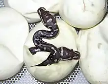 Python anchietae exhibits similar temperament to its closest cousin, the ball python. It hisses, but this is mostly bluff.[3] Diet consists of small mammals and birds.[3] P. anchietae is oviparous, with small clutches of four to five eggs being produced at a time. It is not known whether the females "incubate" their eggs as is typical for the members of this family. Hatchlings are 43–46 cm (17-18 inches) in length.[3]