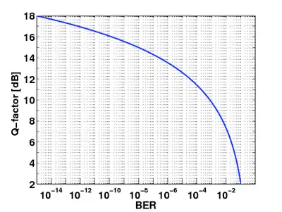 where y is the bit-error rate (BER) of the digitally modulated signal under analysis. For instance, for QPSK in additive white Gaussian noise, the Q-factor defined above coincides with the value in dB of the signal to noise ratio that yields a bit error rate equal to y.