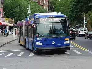 In spring 2013, 60-foot (18 m) articulated buses began replacing the standard 40-foot (12 m) buses on the route. The Q10 was the second route in Queens to receive articulated buses, after the Q44. At the time, the Q10 was the third busiest route in the city and its buses were frequently overcrowded.[36] The use of articulated buses received positive feedback from commuters, but opposition from some local residents and business owners to potential traffic issues and loss of parking spaces.[37][38]