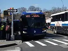 On August 31, 2014, the Q113 local was converted into a limited-stop service called the Q114, running along Guy R. Brewer Boulevard, 147th Avenue, and Brookville Boulevard, and local in Nassau County and the Rockaways. The limited stops eliminated in 2011 were restored for Q114 service, with two additional limited stops added.[1][62] The 2007, 2011, and 2014 changes had originally been proposed in a Urbitran Associates study for the New York City Department of Transportation in 2004, when the bus routes were privately operated.[29] On January 4, 2015, Q114 local service was expanded into evening hours, and Q114 local service now began operating after Q113 Limited service ends.[63] On February 1, 2015, Q114 Limited service started stopping at 147th Avenue and 230th Place (Jamaica-bound) and 147th Avenue and 230th Street (Far Rockaway-bound).[64] In 2016, the corridor began operating low-floor articulated buses in conjunction with its standard-length fleet. This was planned going back to 2012.[65][66][67] In August 2016, the MTA announced plans to eventually convert the Q113 into a Select Bus Service (SBS) route;[68][69] this had been previously proposed by the Pratt Center for Community Development.[70][71]