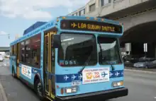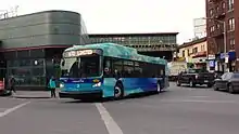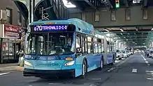 In December 2015, the MTA announced that the Q70 SBS would be implemented in September 2016,[28][29] when it was rebranded as the LaGuardia Link with the implementation of off-board payment of fares. This is similar as to what the Riders Alliance proposed, but the route would still require a free transfer or a regular fare.[30] As opposed to other SBS routes, the Q70 was to be wrapped in a teal blue scheme with silhouettes of clouds and airplanes. The buses would also have the text "LaGuardia Link" on the front, back, and both sides, in addition to the route emblems for the E, F, M, R, and 7 routes and the abbreviation "LIRR," which connect to the bus at Woodside–61st Street and at Jackson Heights–Roosevelt Avenue. The rebranding was to encourage more people to take public transportation when using the airport.[31][32] The insides of the buses were to have air traveler branded messaging.[2]