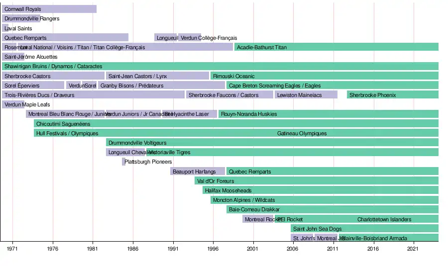 - 1969– First season, 2 divisions. East: Quebec City Remparts, Shawinigan Bruins, Drummondville Rangers, Sorel Éperviers (Black Hawks), Trois-Rivières Ducs (Dukes), and Sherbrooke Castors (Beavers). West: Saint-Jérôme Alouettes, Cornwall Royals, Rosemont National, Verdun Maple Leafs, and Laval Saints.