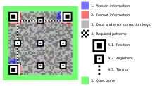 A QR code consists of black squares arranged in a square grid on a white background, including some fiducial markers, which can be read by an imaging device such as a camera, and processed using Reed–Solomon error correction until the image can be appropriately interpreted. The required data is then extracted from patterns that are present in both horizontal and vertical components of the image.[4]