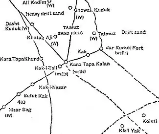 Qarah Tappeh (also Kara Tapa Kalan and Qara Tepe Kālan) is a fortified village in southern Khamyab District, Jowzjan Province, Afghanistan. It has an altitude of 248 m. (816 ft.). It was a crossroads for goods between the Andkhoy - Khamyab (town) route and the Kerki - Akcha route.