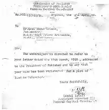 According to a history book by Muhammad Ismail Zabeeh, Qazi Abdur Rehman Amritsari proposed the name of the city.[2][3] The Government of Pakistan confirmed on 11 March 1960 that the name of Islamabad is proposed by Qazi Abdur Rehman Amritsari in a letter sent to him by the Federal Capital Commission.[4]