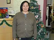 Muskoxen were not domesticated until 1954.[7] Domestication began with the Musk Ox Project, headed by John J. Teal, Jr with the first domestic muskox farm in Fairbanks, Alaska. The project continues at the muskox farm in Palmer, Alaska.[8] The Oomingmak Musk Ox Producer's Cooperative was formed in the late 1960s by indigenous women on Nunivak Island, with the help of Dr. Teal and Mrs. L. Schell. It is a knitting cooperative that works with qiviut and is still in operation today. The cooperative has its headquarters in Anchorage, Alaska, and is owned by approximately 200 native Alaskans from many remote villages in Alaska.[9] The name of the cooperative comes from the Inuit language word for muskox, umingmak,[1] "the animal with skin like a beard."