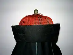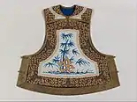 In the early 1652, surcoat with insignia badges started to be worn to indicates its wearer's rank.[26] They were also wearing a three-quarter length surcoats, called duanzhao, which was entirely lined with fur; these were used on cold weather days.[26] The duanzhao were considered luxurious, and they were eventually restricted to the members of the elites (nobles and officials of the top three ranks) and to the imperial guards; the type of fur and the lining colour was worn accordingly to its wearer's rank.[26]