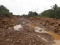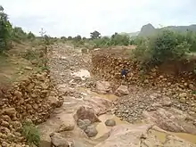 Runoff mostly happens in the form of high runoff discharge events that occur in a very short period (called flash floods). These are related to the steep topography, often little vegetation cover and intense convective rainfall. The peaks of such flash floods have often a 50 to 100 times larger discharge than the preceding baseflow.[2] The magnitude of floods in this river has however been decreased due to interventions in the catchment. Physical conservation structures such as stone bunds[3][4] and check dams intercept runoff.[5][6] On many steep slopes, exclosures have been established; the dense vegetation largely contributes to enhanced infiltration, less flooding and better baseflow.[7]