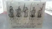 The military of the Nguyễn dynasty (Vietnamese: Quân thứ; chữ Nôm: 軍次) were the main military forces of the Nguyễn dynasty from 1802 to August 1945 when it was dismantled by the August Revolution.[10] The Nguyễn military force was initially formed by Nguyễn Hoàng as a division of the military of the Revival Lê dynasty in 1558 starting out with 3000 soldiers.[10] During this period it was the military forces of the domain of the Nguyễn lords and commonly fought the Trịnh lords who controlled northern Vietnam.[10] During the Tây Sơn Rebellion it was expelled out most of the county by the Tây Sơn dynasty.[10] After the exiled Nguyễn Phúc Ánh returned and defeated the Tây Sơn rebels he crowned himself as the Gia Long Emperor and the Nguyễn military became the national military of Vietnam.[10]