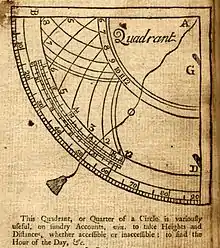In 1618 English Mathematician Edmund Gunter further adapted the quadrant with an invention that came to be known as the Gunter quadrant.[13] This pocket sized quadrant was revolutionary because it was inscribed with projections of the tropics, the equator, the horizon and the ecliptic. With the correct tables one could use the quadrant to find the time, the date, the length of the day or night, the time of sunrise and sunset and the meridian. The Gunter quadrant was extremely useful but it had its drawbacks; the scales only applied to a certain latitude so the instrument's use was limited at sea.