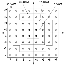 QAM is used extensively as a modulation scheme for digital telecommunication systems, such as in 802.11 Wi-Fi standards. Arbitrarily high spectral efficiencies can be achieved with QAM by setting a suitable constellation size, limited only by the noise level and linearity of the communications channel.[1] QAM is being used in optical fiber systems as bit rates increase; QAM16 and QAM64 can be optically emulated with a 3-path interferometer.[2][3]