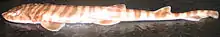 The moderately large and rounded pectoral fins are positioned fairly close to the pelvic fins.[3] Adult males have thin, tapering claspers with a denticle-covered knob on the outer side near the tip.[4] The first dorsal fin is placed just behind the pelvic fin bases, while the larger second dorsal fin is placed just behind the anal fin. The anal fin is larger than the second dorsal fin and comparable in size to the pelvic fins. The caudal fin has a small but discernible lower lobe and a large upper lobe with a notch in its trailing margin.[3] The thick skin is covered by dermal denticles, which have arrowhead-shaped crowns with a central ridge and three posterior teeth.[6] This shark has a striking dorsal color pattern consisting of over 20 narrow, dark brown vertical bars on a light brown background; the bars run from the head to the tail and extend onto the dorsal fins. The underside is off-white, and the pectoral, pelvic, and anal fins have pale trailing margins. The largest known specimen is 37 cm (15 in) long.[3][5]