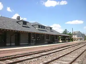 The Quakertown Passenger and Freight Station is a historic train station and freight depot located at Quakertown, Bucks County, Pennsylvania. The two buildings were designed by Wilson Bros. & Company in 1889 and built by Cramp and Co. for the Philadelphia and Reading Railroad in 1902. The passenger station is constructed of dark Rockhill granite and Indiana limestone and is in a Late Victorian style. It is 1+1⁄2 stories tall and measures 25 feet (7.6 meters) wide by 97 feet 6 inches (29.72 meters), long. It has a hipped roof with an eight-foot overhang. The freight station is a 1+1⁄2-story, rectangular stone block building measuring 128 by 30 feet (39.0 by 9.1 meters). Also on the property is a large crane that was used for freight movement.[3] The Quakertown station had passenger rail service along the Bethlehem Line to Bethlehem and Philadelphia until July 27, 1981, when SEPTA ended service on all its intercity diesel-powered lines.[4] SEPTA still owns the line and leases it to the East Penn Railroad. Other towns, stations, and landmarks on the Bethlehem Line are Perkasie, Pennsylvania, Perkasie Tunnel, and Perkasie station.