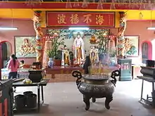 The main altar inside the pagoda is dedicated to Mazu. Her Vietnamese name Thien Hau is a transcription of her Chinese epithet Tianhou, meaning "Empress of Heaven". She is also known as A Pho,[1] a calque of her Cantonese epithet A-ma, meaning "Beloved Mother". Both roles cause her to be syncretized with both the Virgin Mary and Guanyin. In the center, Mazu stands tall dressed in multicolored robes and crown, her golden face serene and dispassionate. The lady is flanked by much shorter attendants, and scowling demons stand guard in front of her. The space in front of the altar is dominated by pillars decorated with relief carvings of coiled yellow dragons. The dragons spiral downwards along the pillars, from heaven above to the ocean below. Off to one side stands a large cast bronze bell.