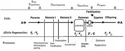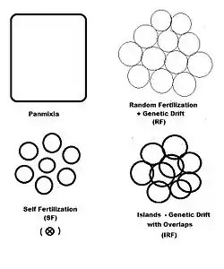 While panmixia may not be widely extant, the potential for it does occur, although it may be only ephemeral because of those local perturbations. It has been shown, for example, that the F2 derived from random fertilization of F1 individuals (an allogamous F2), following hybridization, is an origin of a new potentially panmictic population.[18][19] It has also been shown that if panmictic random fertilization occurred continually, it would maintain the same allele and genotype frequencies across each successive panmictic sexual generation—this being the Hardy Weinberg equilibrium.[13]: 34–39 [20][21][22][23] However, as soon as genetic drift was initiated by local random sampling of gametes, the equilibrium would cease.