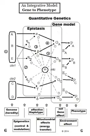 Being a statistician, he defined the gene effects as deviations from a central value—enabling the use of statistical concepts such as mean and variance, which use this idea.[9] The central value he chose for the gene was the midpoint between the two opposing homozygotes at the one locus. The deviation from there to the "greater" homozygous genotype can be named "+a" ; and therefore it is "-a" from that same midpoint to the "lesser" homozygote genotype. This is the "allele" effect mentioned above. The heterozygote deviation from the same midpoint can be named "d", this being the "dominance" effect referred to above.[10] The diagram depicts the idea. However, in reality we measure phenotypes, and the figure also shows how observed phenotypes relate to the gene effects. Formal definitions of these effects recognize this phenotypic focus.[11][12] Epistasis has been approached statistically as interaction (i.e., inconsistencies),[13] but epigenetics suggests a new approach may be needed.