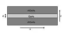 One of the simplest quantum well systems can be constructed by inserting a thin layer one type of semiconductor material between two layers of another with a different band-gap. Consider, as an example, two layers of AlGaAs with a large bandgap surrounding a thin layer of GaAs with a smaller band-gap. Let’s assume that the change in material occurs along the z-direction and therefore the potential well is along the z-direction (no confinement in the x–y plane.). Since the bandgap of the contained material is lower than the surrounding AlGaAs, a quantum well (Potential well) is created in the GaAs region. This change in band energy across the structure can be seen as the change in the potential that a carrier would feel, therefore low energy carriers can be trapped in these wells.[7]