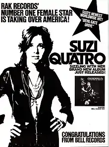 Quatro is Suzi Quatro's second album, released in October 1974 by Rak Records as SRAK 509,[1] with the exceptions of the United States and Canada (where the album was released by Bell Records), Japan (EMI Records) and several territories in Europe (Columbia Records).
