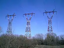Hydro-Québec TransÉnergie uses several different types of electricity pylons to support their 735 kV power lines.[5] All of them are single-circuit, meaning that each pylon carries one power line with three bundles of four electrical subconductors separated by spacers,[29] with each bundle transmitting one phase of current.