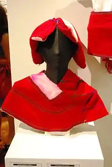 The quechquemitl has been variously described as a shawl, a cape and a triangular cloth, despite only resembling these somewhat when worn.[1] Most quechquemitls are two pieces of rectangular cloth sewn together, and most often worn off the shoulders, covering the upper body. Most have points which can hang down the front and back or over the arms.[2][3] Quechquemitls are generally worn with various other garments, such as a wraparound skirt tied with a sash, huipil and blouse. The size of the quechquemitl depends on how it is to be worn as well as its relation to other pieces of clothing. Its effect on the overall outfit is determined on this relationship, rather than standing along as a long huipil can.[1] The garment is used for everyday wear, social and ritual occasions.[4]