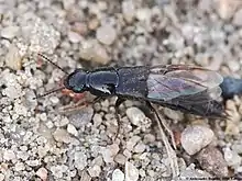 Quedius fuliginosus is a beetle found in Britain and, possibly by traveling in dry ballast, North America.[1] It is similar in appearance to Quedius curtipennis, which is a more common species, however, the eyes of fuliginosus are more convex and the basal antennal segments darker. The punctures on the elytra are slightly stronger in curtipennis.