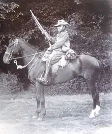 After the evacuation of Gallipoli, it returned to Egypt in January 1916 and became part of the 6th Mounted Brigade, an independent brigade that was involved in the action of Agagia in February 1916.[15] At this battle, the retreating Senussi were attacked by the Dorset Yeomanry with drawn swords across open ground.[16] Under fire, the Yeomanry lost half their horses, and about a third of their men and officers were casualties (58 of the 184 who took part). Colonel Soutar, leading the regiment in this charge, had his horse shot from under him and was knocked unconscious. When he came to, he found himself alone amongst a group of the enemy. He drew his revolver, shot several, and took the Turkish leader Jaffir Pasha prisoner.[17]