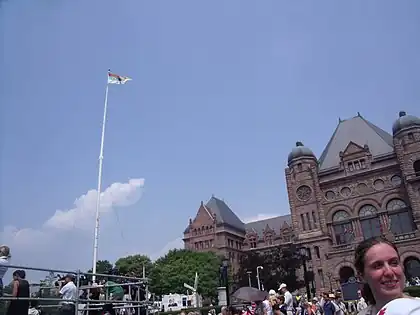 Queen Elizabeth II's personal Canadian standard flies from the main flagpole to mark her presence at the Ontario Legislative Building in Toronto, 6 July 2010