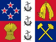 The flag is divided into four quadrants: The first quadrant includes depicts four stars as representative of the Southern Cross constellation, as depicted on the national flag. The second quadrant consists of a golden fleece on a red field. The third quadrant contains a golden wheat sheaf on a red field. The final quadrant includes two crossed gold hammers on a blue field.