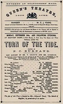 Initially, the management was run by the actor Alfred Wigan, who also appeared in its productions. By 1868, Hodson and Labouchère were living together out of wedlock,[6] as they could not marry until her first husband finally died in 1887.[7] Labouchère bought out his partners and used the theatre to showcase Hodson's talents.[8] The theatre hosted comedies, such as F. C. Burnand's The Turn of the Tide (1869, starring Hermann Vezin and George Rignold with Hodson), historical dramas, such as Tom Taylor's Twixt Axe and Crown (1870), popular revivals of Shakespeare (starring such famous actors as Samuel Phelps) and Tommaso Salvini, dramatisations of Dickens novels, burlesques and extravaganzas. Although the theatre was among the largest and best equipped in London, and featured some of London's most famous stars, it lacked the guidance of an actor-manager of the stature of Henry Irving or Herbert Beerbohm Tree.[9]