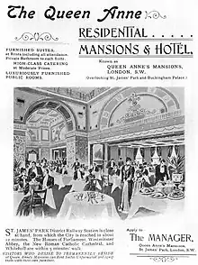It may have been legal complications that led him, for the remainder of the work, to employ an architect, E. R. Robson. Robson continued the mansions around the central courtyard, leaving Queen Anne's Lodge[3] as the sole survivor of the residential properties that had formerly stood on the site. Just before the turn of the century, however, Hankey ran into financial difficulties and the property passed into the hands of the Official Receiver. Under new management, the west block became a hotel and the remainder was let as flats and service suites.