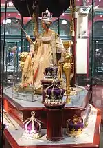 The building also contains many memorials and historic displays. Of these, two large glass cases, removed in 2009–10, stood out. The first display case contained an Imperial Chinese Bridal Carriage made entirely of jade and weighing over two tonnes, the only example found outside China. The second was a life-sized figure of Queen Victoria in a replica of her Coronation regalia, and surrounded by replicas of the British Crown Jewels. Her enthroned figure rotated slowly throughout the day, fixing the onlooker with a serene and youthful gaze. The regalia is now on display at the Museum of Australian Democracy.