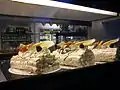 Budapestlängd[5] Sweden A rolled meringue-hazelnut cake filled with whipped cream and pieces of canned peach, apricot, or mandarin orange.