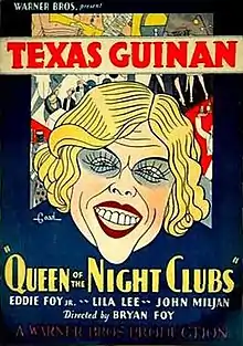 Queen of the Night Clubs is a 1929 American Pre-Code musical drama film produced and directed by Bryan Foy, distributed by Warner Bros., and starred legendary nightclub hostess Texas Guinan. The picture, which featured appearances by Eddie Foy, Jr., Lila Lee, and George Raft, is now considered a lost film.[3] A still existing vintage movie trailer of this film displays no clip of the feature.