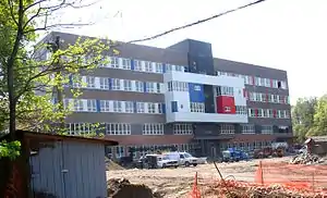 Queens Metropolitan High School is housed in the Metropolitan Educational Campus, located on the south side of Metropolitan Avenue just east of Woodhaven Boulevard. This block, which it shares with a shopping center, was formerly an industrial superblock. The campus is built between the currently inactive Rockaway Beach Branch and freight-only Montauk Branch of the Long Island Rail Road, on the site where tracks from the Montauk Branch formerly curved north onto the Rockaway Branch towards the Main Line, and adjacent to the former Parkside station.[6][7] The original plans called for the building to accommodate two primary or middle schools and two 500-seat high schools, adding over 2,000 Queens public school seats in total.[6] As constructed, the campus added 1,911 seats.[8]