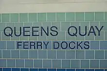 The station is named after Queens Quay, an adjacent street skirting Toronto's waterfront. The station's internal signage bears the subtitle "Ferry Docks", a reference to the nearby Jack Layton Ferry Terminal for the Toronto Island ferries that provide pedestrian access to the Toronto Islands.
