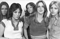 Queens of Noise was released in January 1977 on three different formats: vinyl record, Musicassette, and Stereo 8 track tape.[3] The cover features all five of the Runaways dressed in similar black shirts and pants, all "clinging to long, metallic shafts"[6] in a design that Marianne Moro describes as a "stripper pole album cover theme".[7] The Runaways are partially obscured by smoke in the photograph that was used on the front cover of the album, which according to Fox was taken "at the last moment before we all started choking".[4] The back cover features a similar photograph that is posed differently and does not include any smoke,[3] which Fox notes was originally intended to grace the front of the album, while the eventual front image was initially planned to be put on the back.[4] After Fox suggested that the smoke-filled image would draw more attention on the front of the album, as well as noting the practical concern that it would not lend itself well to having the track listing and other notes printed over it, Mercury Records agreed and switched the covers.[4]