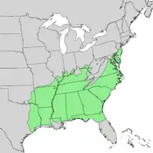 Quercus falcata occurs in sandy, loamy or clay soils of upland sites. These soils are often dry, acidic and nutrient poor.[4] In suitable habitats, the species can be found from southern New York (Long Island) south to central Florida and west to Missouri, Oklahoma, and Texas.[11] In the northeastern portion of its range the species is relatively rare and found almost exclusively along the coast; its highest prevalence is throughout the piedmont region of the Southeast.[12]