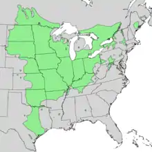 Bur oaks primarily grow in a temperate climate on the western oak–hickory forested regions in the United States and into Canada.[9] It commonly grows in the open, away from dense forest canopy. For this reason, it is an important tree on the eastern prairies, often found near waterways in otherwise more forested areas, where there is a break in the canopy. It is drought resistant, possibly because of its long taproot. At the end of the growing season, a one-year sapling may have a taproot 1.37 m (4+1⁄2 ft) deep and a lateral root spread of 76 cm (2+1⁄2 ft).[10] The West Virginia state champion bur oak has a trunk diameter of almost 3 m (10 ft).
