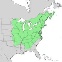 The species grows from the north end of the Great Lakes, east to Nova Scotia, south as far as Georgia, Mississippi, Alabama, and Louisiana, and west to Oklahoma, Kansas, Nebraska, and Minnesota.[8]