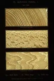 Canker pathogen, Diplodia corticola, has become a major pathogen to the species over the last decade, causing leaf browning, bark cracking and bleeding, and high rates of tree mortality across the northeastern United States.[12] The northern red oak is also characterized as one of the most susceptible species to plant fungi Phytophthora cinnamomi and Phytophthora ramorum, which have caused severe, red-black cankers in the trunk region of the species.[13][14][15] Both P. cinnamomi and P. ramorum grow under warmer temperature conditions; as a result, northern red oak trees found in California, France, and northern Spain all have a higher incidence of fungal infection.[15][16] Oak Wilt caused by the fungus Ceratocystis fagacearum is a major pathogen found in eastern North America that can kill trees quickly.[17]
