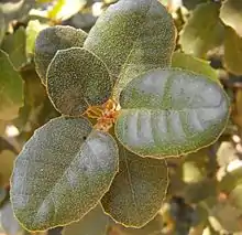Island oak is a tree growing up to 20 metres (66 feet) in height.[5] The mature tree has a grayish to reddish brown trunk with scaly, furrowed bark.[3] The twigs are reddish and covered in woolly hairs. The leathery leaf blades are often concave and are an oblong lance shape or oval with pointed or rounded tips. The edges are smooth or toothed.[5] The upper surfaces are dark green and lightly hairy when new, losing the hairs over time. The undersides are gray-green and coated in woolly hairs, becoming less woolly with age.[3] They are usually 7 to 10 centimetres (2+3⁄4 to 4 inches) long, sometimes up to 12 cm (4+3⁄4 in). The acorn grows singly or in pairs. The cup has thick scales and woolly hairs and is up to 3 cm (1+1⁄8 in) wide. The nut is up to 3.5 cm with a rounded tip.[3][5]