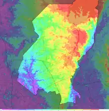 The geography of Quezon City is characterized by undulating terrain. The city is within the catchment area of five river systems – Marikina, Pasig, San Juan, Tullahan and Meycauayan – along with their creeks and tributaries with a total length of almost 200 km (120 mi).[54] The city has an area of 161.11 km2 (62.20 sq mi), according to the 1995 GIS graphical plot, making it the largest Local Government Unit (LGU) in Metro Manila in terms of land area.[36] Since its creation in 1939, the city's boundary were revised four times; the final revision was made thru Republic Act No. 1575, which placed the city's territory at 151.06 square kilometers (58.32 sq mi).[5] Meanwhile, the Philippine Statistics Authority placed the city's land area at 171.71 square kilometers (66.30 sq mi), based on data provided by the Land Management Bureau. According to the Philippine Institute of Volcanology and Seismology and Geoscience Australia on their study earthquake impact and risk assessment on the Greater Metropolitan Manila Area, the total area of Quezon City is at 165.33 km2 (64 sq mi).[55][56]