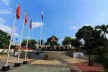 All of the three major monuments commemorating the Martial Law era are located in Quezon City.[44] The People Power Monument and the EDSA Shrine were built in the city to commemorate the event, with the latter being a symbol of the role that the Catholic Church played in the restoration of democracy in the Philippines. The Bantayog ng mga Bayani was constructed along Quezon Avenue to honor the heroes and martyrs that struggled under the 20-year Marcos regime. The Wall of Remembrance at the Bantayog honors prominent figures during the martial law era.[45][46]
