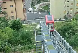 The Quezzi elevator (Italian: Ascensore inclinato di Quezzi) is a public inclined elevator with variable slope in the Quezzi quarter of Genoa, Italy. The elevator opened in May 2015 and connects the lower terminus at Via Pinetti to the terminus at Via Fontanarossa, with an intermediate stop at Portazza.[1][2]