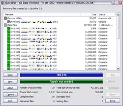 ![]() QuickPar 0.9 checking a series of RAR files for integrity. | |