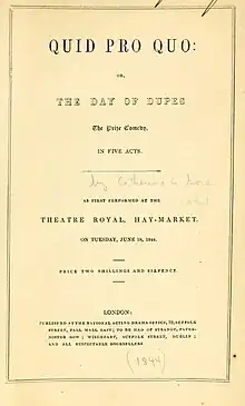 Quid Pro Quo is an 1844 comedy play by the British writer Catherine Gore, best known for her novels. It premiered at the Theatre Royal, Haymarket in London on 18 June 1844.[1] The original cast included Louisa Cranstoun Nisbett as Lord Bellamont, Robert Strickland as Jeremy Grigson, John Buckstone as Captain Sippet, William Farren as Sir George Mordent, Henry Howe as Rivers, Julia Bennett as Lady Mary Rivers, Julia Glover as Mrs. Grigson, Mrs. Edwin Yarnold as Ellen and Anne Humby as Bridget Prim. The prologue was spoken by Benjamin Webster. The play was selected in a competition by a special committee led by Charles Kemble out of ninety six entries, for which Gore was rewarded with £500.[2]