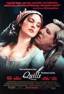 Quills is a 2000 period film directed by Philip Kaufman and adapted from the Obie award-winning 1995 play by Doug Wright, who also wrote the original screenplay.[4] Inspired by the life and work of the Marquis de Sade, Quills re-imagines the last years of the Marquis's incarceration in the insane asylum at Charenton. It stars Geoffrey Rush as de Sade, Kate Winslet as laundress Madeleine "Maddie" LeClerc, Joaquin Phoenix as the Abbé de Coulmier, and Michael Caine as Dr. Royer-Collard.