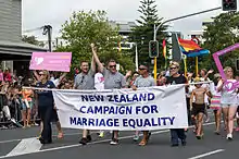 The Legalise Love campaign was launched in August 2011 to promote legal marriage and adoption equality in New Zealand, and a protest was organised at the New Zealand Parliament Buildings in October that year.[55][56][57] In December 2012, former Governor-General Catherine Tizard starred in an online video campaign organised by the Campaign for Marriage Equality supporting same-sex marriage, alongside New Zealand singers Anika Moa, Boh Runga and Hollie Smith, as well as Olympian Danyon Loader.[58] The Human Rights Commission, which also supports same-sex marriage, said that if the marriage bill is passed churches will not be forced to perform marriages between same-sex couples.[59]