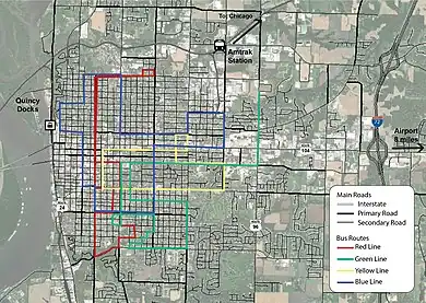 Quincy Transit Lines provides fixed-route and paratransit bus service throughout Quincy.[53] There are four fixed routes, and each route is split into two branches.[54] Those routes run Monday–Saturday, between 6:00 am and 6:00 pm. During Sundays and holidays, Quincy Transit Lines operates a pared-down version of the fixed-route system that is made up of two routes – the North route and the South route.[55]